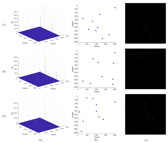 Nine Gaussian white noise simulated star images with a standard deviation of 2 were generated by providing nine LOS directions and exposure times. The matching and recognition results of the observed star and the guide star are shown in Figure 12, Figure 13 and Figure 14. Figure 12a represents the distribution of star points in the focal plane. Figure 12b represents the distribution of the observed star on the focal plane following centroid extraction. Figure 12c represents the guide star in the FOV, and the red circle is the matched guide star. From Figure 12, Figure 13 and Figure 14, it can be concluded that the matching algorithm based on polar coordinate comparison-AND could accurately identify the guide star corresponding to the observation star.