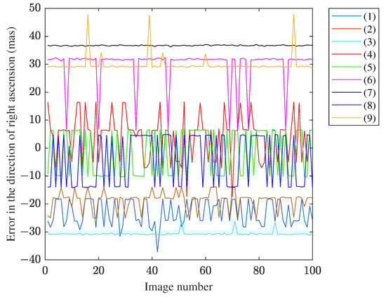 One hundred frames of different Gaussian white noise simulation images with a standard deviation of 2 were generated for nine LOS directions, the matching calculation was carried out for each of them, and the LOS pointing error and matching calculation time were calculated. The error in the right ascension direction and declination direction of the calculation results of 100 frames is shown in Figure 15 and Figure 16, respectively. From the two figures, it could be concluded that the error fluctuated under the influence of noise, but in general, regardless of the right ascension direction or declination direction, the error was within 50 mas.
