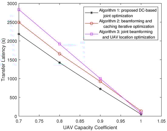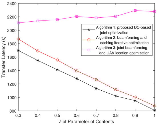 Firstly, we observe the impact of the UAV capacity coefficient on the system latency. We set the Zipf parameter . As it is shown in Figure 2, the latency performance of the proposed algorithm is better than those of the two benchmark algorithms. The delay decreases with the increase in UAV coefficient, which means expanding the cache capacity of UAVs would achieve a higher network efficiency. And, note that the average transmission latency of Algorithm 3 gets closer and closer to that of proposed Algorithm 1, while changes from 0.7 to 1. When , the latency of Algorithm 3 is almost the same as that of Algorithm 1 because if , which means UAVs obtain enough capacity to cache all the contents, users do not need to request content from MBS. In this case, the content placement in UAVs has little impact on the average transmission latency.