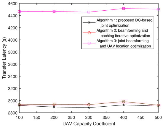 Then, in Figure 3, we consider the impact of Zipf parameter . The UAV capacity coefficient is set as . We increase from 0.3 to 1, and it is observed that the latency of Algorithm 1 is decreased. Predictably, the performance of Algorithm 2 is relatively poor compared with Algorithm 1, and the trend of its curve is consistent with that of Algorithm 1. Note that the performance of Algorithm 3 is much worse and that the trend of its curve is different from those of Algorithms 1 and 2. Via an analysis, the reason behind the difference is whether the caching strategy is optimized. Content placement is fixed in Algorithm 3, and the trend of its curve is related to the sizes of the files. The latency of Algorithm 3 is directly proportional to the expectation of the content size. If the size of content with a high popularity is relatively larger, the expectation of the content size will increase with the increase in the Zipf parameter; otherwise, the opposite happens. Especially, if all the contents are the same size, no matter how the request probability changes, the expectation of the content size will not change, and the curve mentioned above tends to be a horizontal straight line. In general, we can observe that the optimization of the caching strategy is more effective when the Zipf parameter is larger.