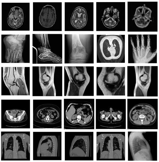 The datasets in this paper are sourced from Medical Imaging Park and the American Institutes for Research, employing the datasets from the categories of the brain, abdomen, chest, bones, and muscles. We selected 350 original medical images as the training set, 150 original medical images as the validation set, and 100 original medical images as the test set, and some of the medical images are shown in Figure 4. To improve the algorithmis capacity to extract visual features, we perform data enhancement on the selected dataset as shown in Table 1. Because the NasNet-Mobile pre-training network requires the input image pixels to be 224 × 244, the image size needs to be set to 224 × 224, so that we get 37,450 training sets with 224 × 224 pixels and 16,050 validation sets. We perform 2D-DCT transform on the training and test set images and select 128 low-frequency components of 16 × 8 as the data set labels.