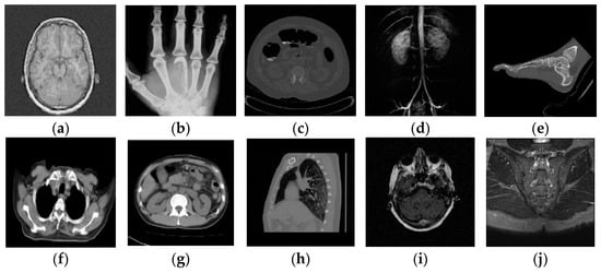 Different medical images within the test (a–j).