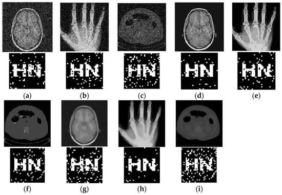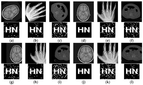 This paper uses MATLAB 2022b software to simulate and experiment on medical images. Since the network input image pixel is 224 × 224, the medical image pixel used for testing is 224 × 224. In this paper, three medical images from the test set are chosen at random for testing, and the watermark image pixel size is chosen as 32 × 32, as seen in Figure 9. The normalized correlation coefficient (NC), as shown in Equation (8), is employed to determine how well the method can withstand assault by comparing how similar the original watermark is to the watermark that was retrieved from the picture after attack. The peak signal-to-noise ratio (PSNR), as shown in Equation (9), is used to represent the quality of the image. In the case of medical images without any attacks, the NC values are all 1.
