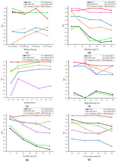 To demonstrate the robustness of the NasNet-Mobil-DCT algorithm and use this algorithm to compare with other algorithms, this comparison experiment uses a brain image as the experimental object, as shown in Figure 9a, because this image is often used by a wide range of medical image watermarking researchers in comparative experiments and is representative. The comparison data are shown in Figure 13, in which black represents the DCT algorithm [32], green represents the DWT-DCT algorithm [33], blue represents the SIFT-DCT algorithm [34], purple represents the KAZE-DCT algorithm [25], orange represents the Inception V3-DCT algorithm [34], and red represents the NasNet-Mobil-DCT algorithm proposed in this paper. The NasNet-Mobil-DCT algorithm offers strong resilience to conventional and geometric attacks, as observed from the experimental data.