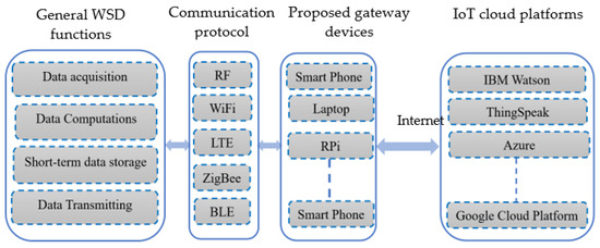 The development of IoT devices necessitates a thorough recognition of the associated security considerations and risks prior to their deployment [18]. One inherent issue associated with the IoT systems is the components that collect environmental data and their links to a microcontroller. These components have the capability to transmit the captured data to external servers for the purposes of storage or subsequent analysis. The issue lies with the non-transparent communication between these devices and the external data servers. These servers can analyse and redistribute the information without direct consent from the user [19]. We have previously addressed this problem by placing a Microduino microcontroller into the WSD that is able to transmit processed data to the gateway using a radio frequency (RF) channel. Both the WSD and gateway RPi utilise identical transceiver devices. Each WSD connected to the RPi is assigned a unique ID [11,12]. Additionally, the data payload accompanying each WSD provides a level of protection for the transmitted data. Furthermore, the data processed in the gateway for cloud upload have a designated channel and are assigned a specific number for data security protection. This level of security is deemed acceptable for the current stage of the study, as security is not the primary focus.