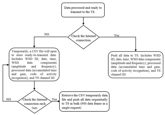 The processed data are temporarily stored on the gateway for the duration of the pre-operative prehabilitation program. At the same time, these data can be transferred to the cloud for visualisation, long-term data storage, and further data analysis. Therefore, the gateway is designed to check Internet connectivity every 5 s in order to push the processed data to the cloud. The gateway is also designed to compensate for Internet interruptions when patients are exercising outdoors. When the Internet is down, a comma separated value (CSV) file is opened and all the data are loaded into the queue, along with the original timestamps (Figure 4). This allows the system to retain the timestamps and the order of the data. The system continually checks the Internet status, and once the connectivity is confirmed a basic header of the data is constructed in the form of a string and the main buffer is initialised.