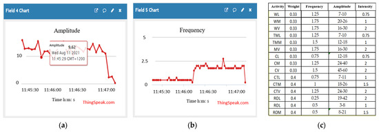 In the initial phase of prehabilitation, patients are required to visit a physical therapy facility to undergo a baseline assessment conducted by healthcare professionals. This initial visit also provides the opportunity to go through programme exercises and establish a preliminary database for individualised activity recognition using the IoT system. Throughout this evaluation, it is imperative that the Internet of Things system is adequately prepared to undertake the analysis, storage, and identification of the primary characteristics of the data obtained from every physical activity. Figure 5a,b show an example of initial session data (amplitude and frequency) from the patient performing physical exercises like walking, treadmill walking, cycling, and rowing activities at low, moderate, and high intensity. The adjacent table (5c) is a database of amplitude and frequency ranges for each activity at the three different intensities.