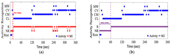 Two methods of activity recognition: (a) M1; (b) M2. R represents ‘recognised’ and NR represents ‘non-recognised activity. CL, CM, and CV represent cycling light, moderate, and vigorous, respectively, and MW represents walking at a moderate intensity.