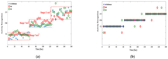 Figure 6a depicts the observed behaviour of M1 during a 6 min period of physical activity. During the initial minute, M1 demonstrated a recognition accuracy of 73% for the observed activity. The data collected during the transition period from rest to cycling at a light intensity (CL) exhibited inconsistent values for a duration of 16 s. However, after this initial period the output data values stabilised, and the CL was consistently detected. As previously mentioned, the M2 technique relies on the storage of 15 incoming readings within a distinct buffer, and subsequently identifying these readings based on the consistency of the data within the buffer. In this example, a minimum threshold data consistency of 80% is used (i.e., the threshold level is arbitrary and subject to change based on the required level of accuracy). Any level of consistency that falls below this threshold will lead to the rejection of the activity. The M2 system has the disadvantage of not being able to detect activity when the buffer data remain below 80%. Furthermore, there are two main factors contributing to the reduction or increase in recognition rates. These are threshold level and buffer size, which can influence the accuracy of activity recognition. For example, if the threshold level is reduced from 80 to 60%, then the M2 method is able to recognise CL activity during the first minute (Figure 6b). In contrast, if the buffer size is reduced to five readings, then M2 would fail to recognise CL during the first 20 s of the first minute of activity. Accordingly, an optimisation is required between the threshold and buffer size to obtain an optimum recognition result based on the M2 method.