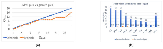 (a) Granted gain versus number of days for a 4-week mixed-mode prehabilitation program. (b) Accumulated time and gain for each physical activity within 4-week prehabilitation program.