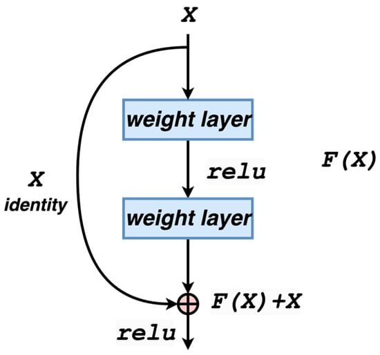 Figure 1 shows the ResNet residual module, which utilizes a shortcut connection to transfer the input across layers and then add it to the result after a convolution operation. In this module, is the input, and is the output. The output after intermediate convolution is a deformed expression of , and the final output is obtained as . The residual function is more accessible to optimize than the direct . The input is connected across layers with the obtained by stacking the weight layers, and the output of the residual module is . The calculation of residuals is more straightforward than the standard calculation, and the residuals will be significantly less challenging for a smaller dataset. Therefore, this paper uses the residual network as the base model. The calculation of the residual unit can be expressed using Equations (1) and (2):