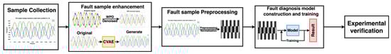 The fault diagnosis method proposed in this pape, as shown in Figure 2, consists of five stages. The first stage involves collecting actual fault data from the three-phase inverter sampling. However, we encountered two issues with the collected fault samples. Firstly, the limited number of samples made it challenging to train a model with a high diagnostic performance. Secondly, some of the collected samples had noise issues during the collection process, which can impact accuracy of the fault diagnosis in later stages. To address these issues, we enhanced the acquired data using fault sample enhancement techniques.