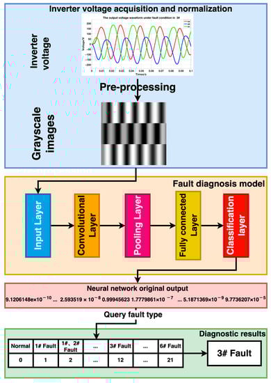Based on the characteristics of the preprocessed samples, we constructed and trained an improved deep residual network. The processed fault samples were input into the trained model, and the network’s original output was a 22-dimensional vector. We extracted the index of the maximum value in the vector to obtain the corresponding fault label. Finally, we utilized the received fault label to retrieve the fault category from Table 1 and ascertain the diagnostic result by considering the open-circuit fault type. It should be noted that in Table 1, 1#–6# represent the transistor numbers in the three-phase inverter. This process concludes completing the fault diagnosis. Figure 3 illustrates the fault diagnosis process in this article.
