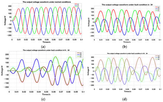 Normal and open-circuit fault output voltage waveforms. (a) Normal-condition output voltage waveform; (b) 3# open-circuit fault output voltage waveform; (c) 1#, 6# open-circuit fault output voltage waveform; (d) 3#, 5# open-circuit fault output voltage waveform.