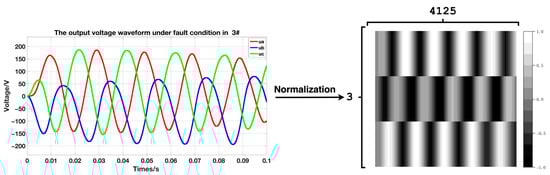 The 21 fault types and normal data obtained under 25 operating conditions are processed, along with five input voltages, five load power mixes, and the data generated by CVAE. The data-processing process is shown in Figure 8 and Figure 9. Firstly, the three-phase data sequences in the fault data file are combined into a two-dimensional matrix. This step is important for the convolutional neural network to extract a large amount of fault detail information from the local differences of the three-phase voltage through convolutional extraction. Then, the matrix elements are normalized to the range of [−1, 1], which is beneficial for avoiding numerical problems such as small network weights and neuron saturation. This normalization approach accelerates network training convergence and improves the network’s generalization ability in the presence of changes in operating conditions. After pre-processing, a single sample can be approximated as a grayscale image with L × 3 pixels, where L represents is the number of single-phase sampling points that correspond to the duration of the sample. In this experiment, the value of L is 4125.