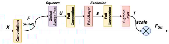 The fault diagnosis model chosen for this paper is the SE-ResNet18 model, which combines a compression-excitation network (SENet) module based on the channel attention mechanism with a deep residual network (ResNet). This model utilizes ResNet18 as the backbone network, which has a reduced number of layers. It enhances accuracy and performance by incorporating the SE (Squeeze-Excitation) [21] module between the convolutional layers. The SE module enables information interaction between channels, enhancing the network’s ability to extract and emphasize relevant features. The structure of the SE module is shown in Figure 10.