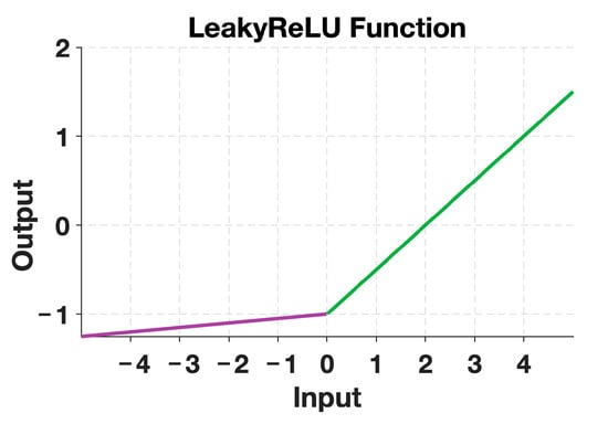Figure 11 displays the image of the LeakyReLU activation function with a value of = 0.01. The purple part represents the output when the input is negative, while the green part represents the output when the input is positive. During the backpropagation process, the gradient can also be calculated for the negative input region of the LeakyReLU activation function. This prevents the issue of neuron “death” and jaggedness in the gradient direction.