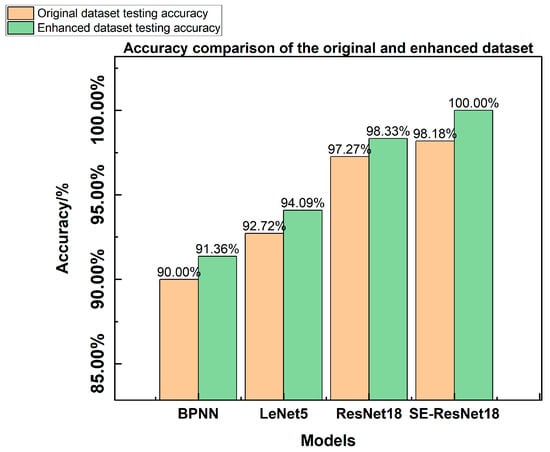 The SE-ResNet18 models were trained using the Adam optimizer with a learning rate of 1 × 10−3 and a maximum of 50 training epochs. The test accuracy of the models is compared as follows.