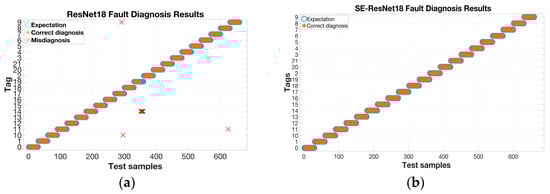 Misdiagnosis and correct diagnosis situations. (a) ResNet18 fault diagnosis results; (b) SE-ResNet18 fault diagnosis results.