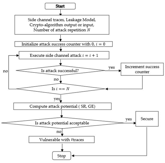 The attacking-style assessment primarily utilizes the device’s side-channel information to recover the key and assess the product’s security against SCAs. The CC [] standard serves as a reference criterion for the attacking-style assessment. The estimators can choose any SCA method from the list of threats to conduct SCAs and assess the product’s security level. Figure 1 illustrates the process of the attacking-style assessment.