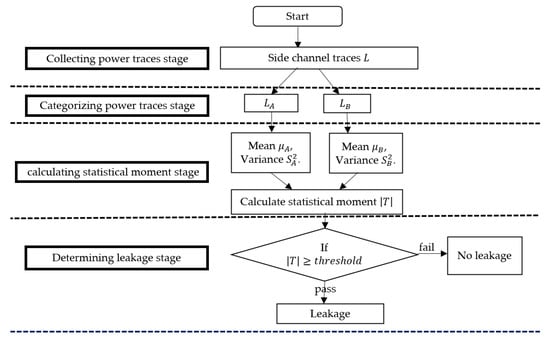 In leakage detection, the evaluators have the ability to control both input and output variables and obtain the side-channel measurements. The process of leakage detection-style assessment primarily encompasses four stages: collecting power traces, categorizing power traces, calculating the statistical moment, and determining leakage. The process of leakage detection-style assessment is shown in Figure 2.