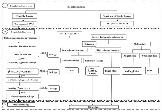 In the phase of optimizing leakage assessment methods, there are three main aspects to consider. Firstly, the optimization of statistical tools aims to replace the t-test of TVLA with alternative statistical tools (such as the paired t-test [], -tests [], Hotelling-tests [], KS tests [], ANOVA [], deep learning [,], etc.). Secondly, the optimization of the detection process involves improving the current TVLA detection process or proposing a new one [,,]. Finally, the optimization of the decision strategy focuses on introducing a new decision strategy, such as the HD strategy [], to determine the stage of leakage.