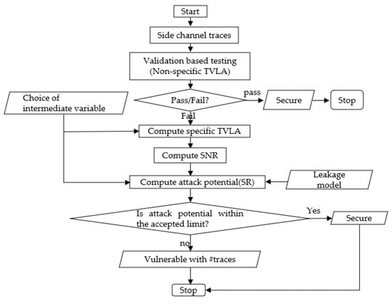 Figure 5 presents the process of hybrid side-channel testing. The process consists of non-specific TVLA → specific TVLA → SR → evaluation results. First, the evaluator performs a non-specific TVLA on the target device, followed by the calculation of SR using specific TVLA. The side-channel vulnerabilities of the target device are assessed without the need for actual attacks. If SR is below the security limit, the device is considered safe; otherwise, it is considered vulnerable to SCA.