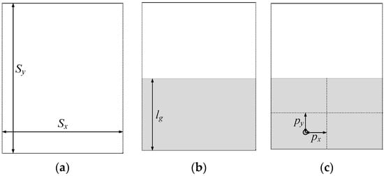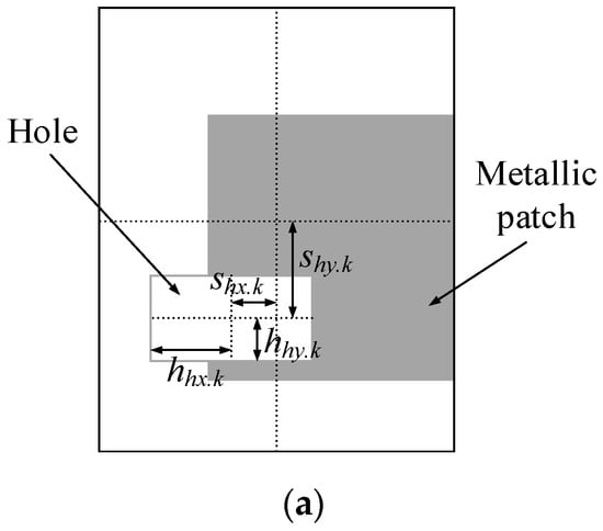 - Substrate: It is assumed to be rectangular, of the size Sx and Sy (cf. Figure 1a). The substrate thickness is h, and its dielectric permittivity is εr (both may be fixed or variable, depending on designer’s needs).