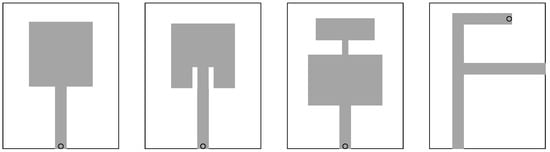 The proposed parameterization allows for rendering a plethora of conventional antenna geometries, some of which are shown in Figure 4, see also Figure 5. The shown topologies are just examples; in practice, the antenna shapes produced by the optimization algorithm are to be irregular, unlike those obtained using the engineering insight. Due to continuously adjusted sizes of metallic patches and holes, the resolution of antenna geometry can be globally and locally altered without the necessity of introducing any additional components. The same can be said about the overall antenna size as well as the overall complexity of the structure. In particular, the number of building blocks can be modified during the design process while maintaining fixed dimensionality of the parameter space. Further, the parameter space dimensionality can be readily adjusted in a linear fashion by adding the number of geometry components, which is in contrast to mesh-type of parameterization, where even small changes in the mesh density have profound effects on the effective number of design variables. Because of being primarily based on continuous variables, the proposed parameterization is suitable to work with local (both gradient-based and stencil-based) optimization algorithms. The proposed parameterization addresses a number of common issues pertinent to unit-cell based approaches (also referred to as pixel-based antennas and similar), which exhibit several serious issues: (i) limited number of antenna topologies, which are confined to the location of the unit cells; (ii) limited resolution of establishing antenna dimensions (also confined to the unit cell size); (iii) considerably larger dimensionality of parameter space, which leads to numerical problems, in particular, longer and therefore more expensive optimization runs; (iv) it is not possible to use gradient-based optimization routines, as antenna design tasks are of combinatorial nature.