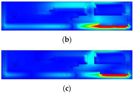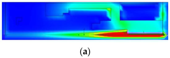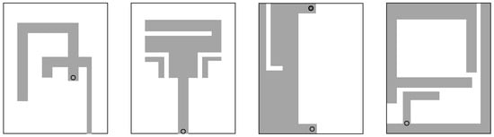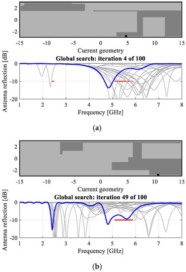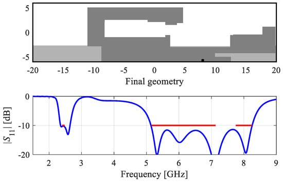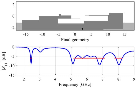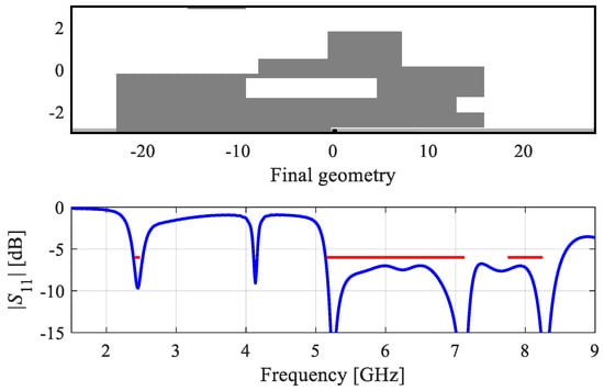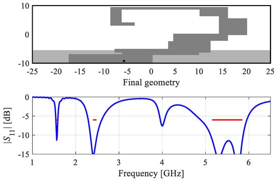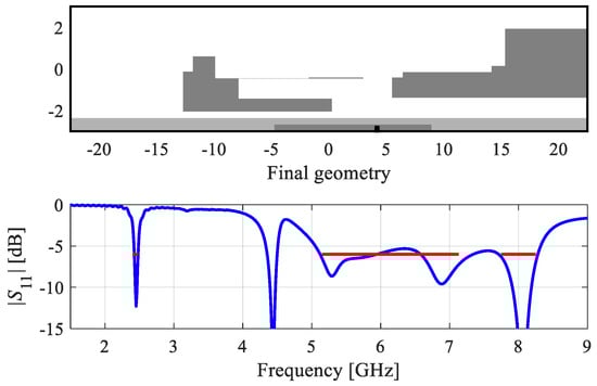 The first example is a dual-band antenna implemented on FR-4 substrate (εr = 4.4, h = 1 mm). The antenna size is predefined to 30 × 6 mm. The ground plane is recessed by 5 mm, and the structure is surrounded by a metallic environment (modeled as perfectly electrical conductor), as shown in Figure 12. The design specifications imposed on antenna reflection are as follows: |S11(x,f)| ≤ −10 dB for 2.40 ≤ f ≤ 2.48 GHz, and 5.1 ≤ f ≤ 5.9 GHz.