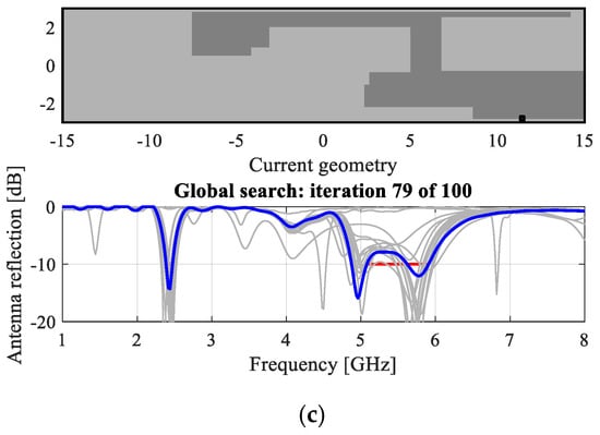 Figure 9 presents the flow diagram of the design process, which is pertinent to both global search outlined in this section, and local tuning (cf. Section 2.5). The process is entirely specification driven with the only input provided by the user being design specifications, and supplementary data (e.g., substrate parameters, design constraints such as the maximum allowed antenna size, etc.). In this work, design specifications are formulated for antenna reflection characteristics. Given the target operating frequency bands [f1.1 f1.2], …, [fK.1 fK.2], where K is the number of bands, the objective is to find antenna geometry for which the maximum in-band reflection level does not exceed −10 dB. Formally, the problem is formulated as