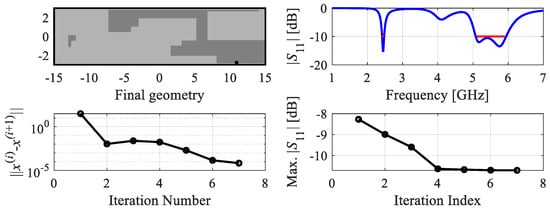 The purpose of the second optimization stage is to improve antenna performance (here, impedance matching over the target operating bands) through local tuning of antenna parameters. In this work, we use a trust-region gradient-based algorithm [] with numerical derivatives [], which is briefly outlined below.