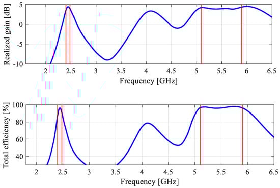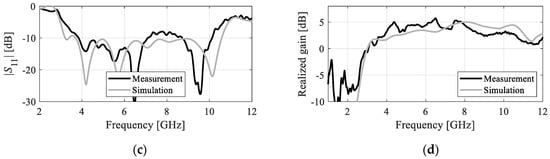 Experimental validation of the triple-band antenna of Figure 23: (a) prototype, (b) measurement setup, (c) simulated and measured reflection response, and (d) simulated and measured realized gain.