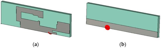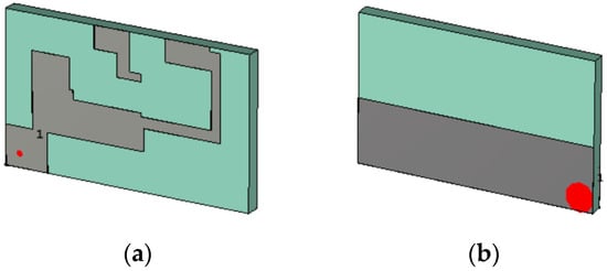 - Discrete port: The port location is px and py with respect to the center of a specified metallization patch, the port to the ground plane, and one of the metallization patches on the front side (cf. Figure 1c).