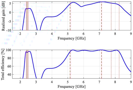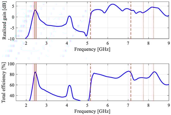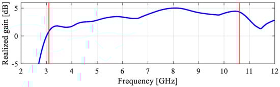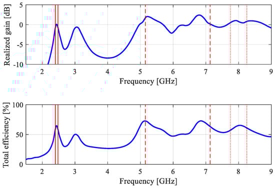 Figure 44 shows the H- and E-plane radiation patterns at 2.45 GHz, 6.15 GHz, and 8.0 GHz. Figure 45 shows the photograph of the prototype of antenna of Figure 27 and its EM-simulated and measured reflection and realized gain characteristics. Figure 46 provides the H- and E-plane radiation patterns at 4.0 GHz, 6.0 GHz, and 8.0 GHz. Finally, Figure 47 and Figure 48 show the data (prototype photograph, reflection, gain, and radiation patterns at 1.575 GHz, 2.45 GHz, and 5.5 GHz) for the antenna of Figure 31. It can be observed that the agreement between the simulated and measured data is satisfactory in all cases. Minor discrepancies are mainly caused by fabrication and assembly inaccuracies. It should also be mentioned that the SMA connectors were not included in the computational models of the considered antenna structures. As these are compact devices, the presence of the connectors affects the electrical length of the ground planes, which may actually improve the antenna operation, especially in terms of impedance matching.