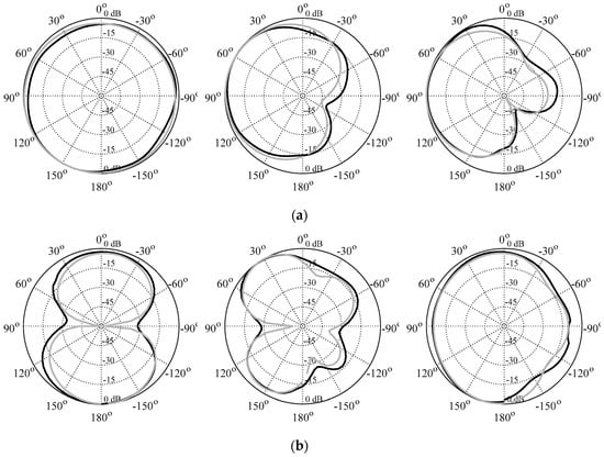 Experimental validation of the triple-band antenna of Figure 27: (a) simulated (gray) and measured (black) yz-plane patterns; (b) simulated (gray) and measured (black) yz-plane patterns. Patterns shown correspond to 4.0 GHz (left), 6.0 GHz (middle), and 8.0 GHz (right).
