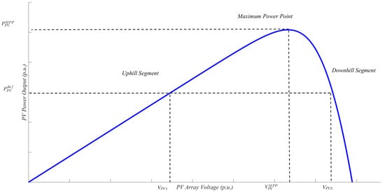 where with superscript k represents the PV voltage reference for the kth iterative step. means that is less than or equal to the MPP and the PV source should now operate in the APC mode by regulating its output power to . There are two solutions to Equation (7). The uphill segment solution (denoted by UHSS) is derived as:
