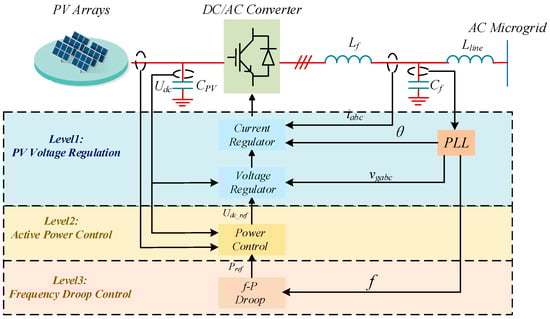 To solve the aforementioned issues, a three-level hierarchical control strategy is designed for PV sources to enable them to contribute to primary FR. Figure 3 presents the control diagram of the proposed FR strategy with a typical single-stage PV generation system. As depicted, the overall strategy comprises three control levels: PV voltage regulation (level 1), active power control (level 2) and frequency droop control (level 3).