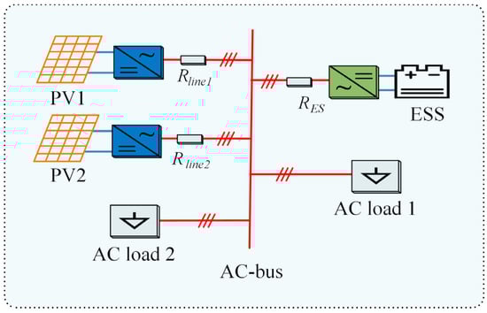 A comprehensive dynamic model of an AC microgrid, composed of two PV sources, a frequency droop type energy storage and two AC loads, is established using Matlab/Simulink R2021b for simulation tests. The system configuration of the studied AC microgrid is shown in Figure 6.