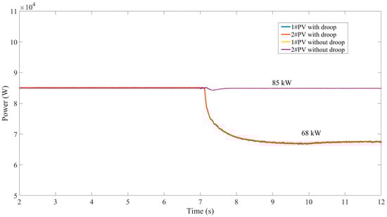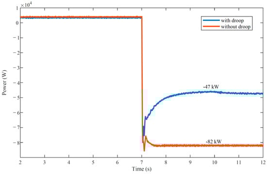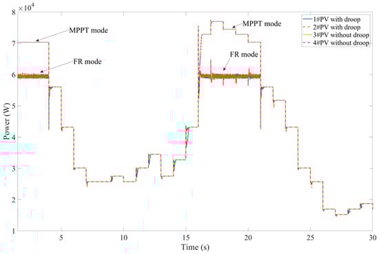 This scenario is mainly to study the effect of PV frequency droop control. Load 2 (85 kW), accounting for approximately 50% of the system’s total load, is offline at 7 s. Comparative simulation tests are conducted, comparing PV sources operating under the conventional MPPT control with those under FR control. The dynamics of the storage output powers, PV output powers and the system frequencies under different control strategies are depicted in Figure 7, Figure 8 and Figure 9, respectively.