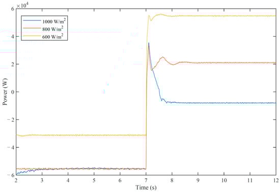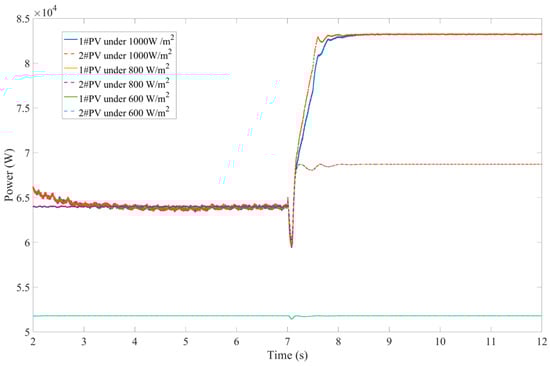 This scenario primarily investigates the effect of different irradiation levels. In this scenario, Load 2 (85 kW), which is 55% of the total system load in Section 5.2, is disconnected at the beginning of the test and recovers at 15 s. Similar to Section 5.1, there are still two cases, one under the MPPT scheme and the other under the proposed control strategy. Both cases are tested with three different irradiation levels (, and , respectively). The dynamics of the storage output powers, PV output powers and the system frequencies are depicted, respectively, in Figure 10, Figure 11 and Figure 12.