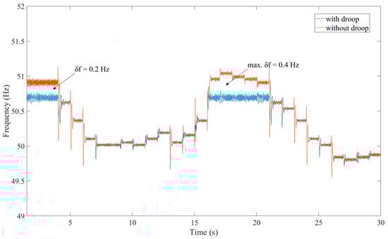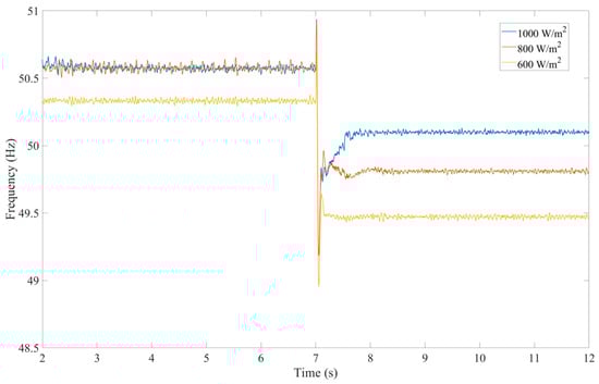 It is apparent that the of the droop characteristic corresponds with and thus correlates with the irradiation and temperature. Specifically, the PV source generates if f while it reduces if f . The proposed strategy thus adapts to various irradiation and temperature conditions. If the irradiation levels are relatively high, the FR capability of the PV source is enhanced while it is diminished under insufficient irradiance. For example, Figure 5 illustrates that at 800 , the PV sources activate FR only when exceeds 50.425 Hz (which is the at 800 ), compared to 50 Hz at 1000 .