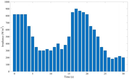 In this scenario, the performance of the proposed control strategy is studied under a real operational scenario. The PV system is simulated over a 30 s period in a typical cloudy day (real irradiance data from [4,30] are used, as shown in Figure 13). The sharp variation of the solar irradiance may be because of a passing cloud, or the shade of a building. Figure 14 and Figure 15 show the time responses of PV output power and the system frequency under both the MPPT mode and the proposed FR mode, respectively. It is proved that the PV power output can follow the change of irradiance immediately, although some frequency and power spikes can be observed when the irradiance changes too sharply. When the PV system operates in the FR mode, and if the irradiance is abundant, the FR service could significantly mitigate the frequency deviation, otherwise, the PV system adaptively switches to the MPPT mode.