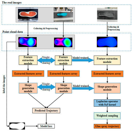 Currently, the advanced intelligent technologies, e.g., deep learning [], computer vision [], and big data analytics [], have shown great potential to be labor-saving technologies in a variety of industrial conditions. In particular, deep learning, a subfield of machine learning that involves building and training multi-layered neural networks, is used to simulate learning and decision-making processes of human brain. The core idea behind deep learning is to automatically learn feature representations from raw data without relying on traditional handcrafted feature engineering. The main advantage of deep learning lies in its ability to automatically learn meaningful representations from the data, making it suitable for tasks such as image and speech recognition, natural language processing, and recommendation systems. For example, L. Bi et al. constructed deep learning algorithms to help doctors diagnose []. W. Wang et al. applied the deep learning technique to remote sensing image segmentation []. Hussain A et al. have applied deep learning to human activity detection []. Computer vision, a science and technology that explores how to enable computers to “see” and “understand” images and videos, allows computers to perceive, comprehend, and interpret visual information through the developed algorithms and models, thereby achieving functionalities similar to the human visual system; for example, W. Fang et al. used computer vision for construction risk monitoring []. B. G. Weinstein has applied computer vision to detect animal species in the field of zooecology []. Remarkably, in the field of computer vision, deep learning has achieved remarkable success in tasks such as image classification [], object detection [], and image generation []. By employing deep convolutional neural networks, computers can accurately identify and classify objects in images, such as faces, vehicles, animals, and more. Thus, integrating the intelligent method of deep learning with computer vision is considered to be an intuitive yet logical approach for automatically generating high-precision spraying trajectories that are suitable for the various types of shoe soles, which possibly can significantly enhance the accuracy, efficiency, and adaptability of spray trajectory generation methods.