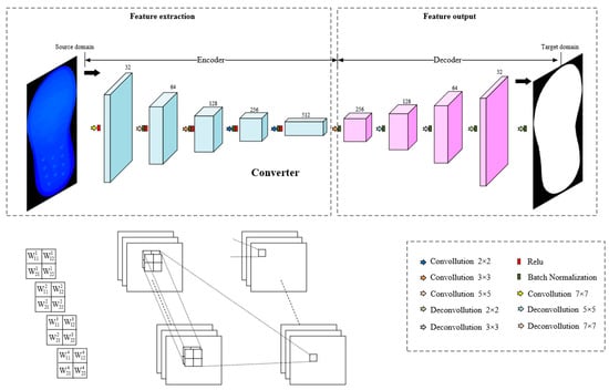 The deconvolution layer is also called a transposed convolution layer, and its purpose is to perform an up-sampling operation []. The deconvolution operation can be viewed as the opposite of the convolution operation. Therefore, the deconvolution layer takes an input feature map and produces an output feature map with a larger spatial resolution. In this work, we defined the deconvolution operation as follows:
