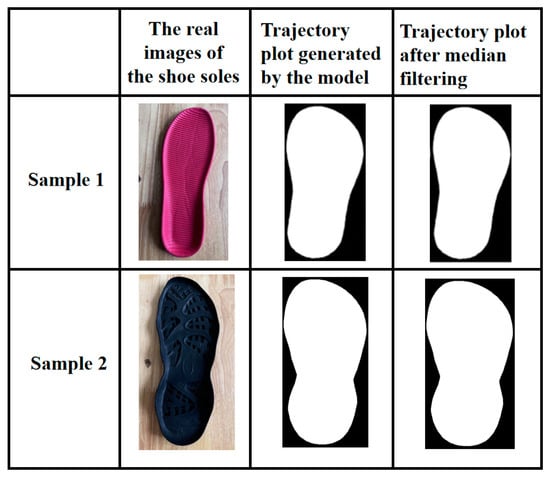After using the established model to process the original data, a binary shoe sole image with a spray trajectory line was generated. We converted the image into the actual spray trajectory of the sole through post-processing.