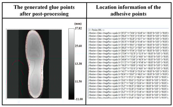 In addition to generating a high-precision spray trajectory, it is also crucial to extract 44 trajectory points in a reasonable manner, particularly in areas with significant curvature. Therefore, we need to include more points on the trajectory line to ensure fine control and accurate adhesive application. Figure 10 displays the post-processed adhesive trajectory points by using our method. It can be observed that these points closely match the actual adhesive path, indicating that our method has precise localization of adhesive points for the spray trajectory generation. We can achieve precise glue application on the shoe sole, ensuring precise positioning and paths for each adhesive point. This not only improves the efficiency of adhesive application but also ensures uniform coverage and quality of the adhesive. Compared to traditional manual adhesive methods, our approach exhibits significant advantages in terms of the accuracy and consistency of adhesive trajectories. This provides reliable technical support for automation and digitization in shoe sole production, thereby enhancing efficiency and quality assurance in the footwear industry.