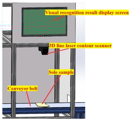 During the process of deep learning, the quantity and quality of training data have a significant impact on the network model. In this study, the used dataset consisted of real shoe sole images captured using the “Qingbo” 3D contour scanner LH model in a factory environment. These images included different types, sizes, and shapes of shoe soles. By collecting real shoe sole image datasets, we could provide more representative and diverse training samples to enhance the generalization ability and performance of the network model. In the process of creating the dataset, we used various image processing methods, such as resizing, rotating, and flipping, to increase the diversity and quantity of the dataset. A total of 70 images were collected, of which 45 were used as the training set and 25 as the test set. Figure 7 shows the platform we built to collect the data, and Table 1 shows the parameters of the 3D contour scanner used in the platform.