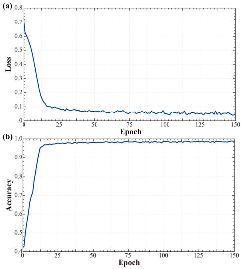 (a) Description of the accuracy changes with the number of epochs; (b) description of the loss function changes with the number of epochs.