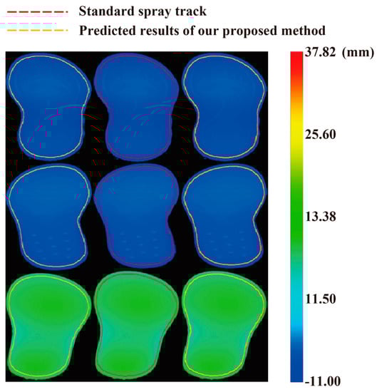 We randomly selected a set of shoe sole point cloud images to test our model. The generated spray trajectories are shown as yellow lines (Figure 9), while the standard spray trajectories for these shoe soles are indicated by the red lines. By comparing the two trajectories placed on the same graph, we can observe that the two lines are almost perfectly aligned. These results demonstrate the reliability of our model in generating spray trajectories for shoe soles. The ability of our model to accurately predict the trajectory enables precise and consistent spray application, leading to improved product quality. Moreover, the excellent alignment between the predicted spray trajectories and the standard ones is a testament to the robustness and generalizability of our model. It successfully captures the intricate details and shapes of various shoe sole designs, allowing for precise reproduction of the desired spray patterns.